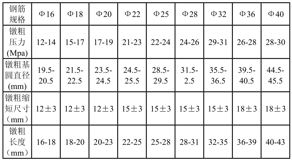 鋼筋鐓粗用的鐓粗機能自動實現對中、夾緊、鐓粗等工序,每次鐓頭所需時間約為30~40s,根據行業標準要求鐓粗壓力與鋼筋直徑有關。高壓油泵要經過標定、自身帶有壓力表,將鋼筋端頭鐓粗至標準的油表讀數要求壓力即可,在每批鋼筋加工前作鐓頭試驗,以鐓粗量合格為標準來調整 佳鐓粗壓力和縮短量。